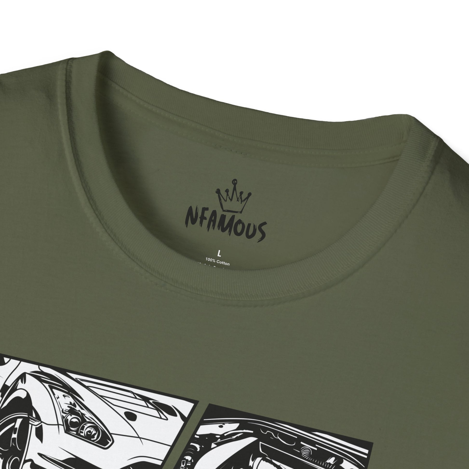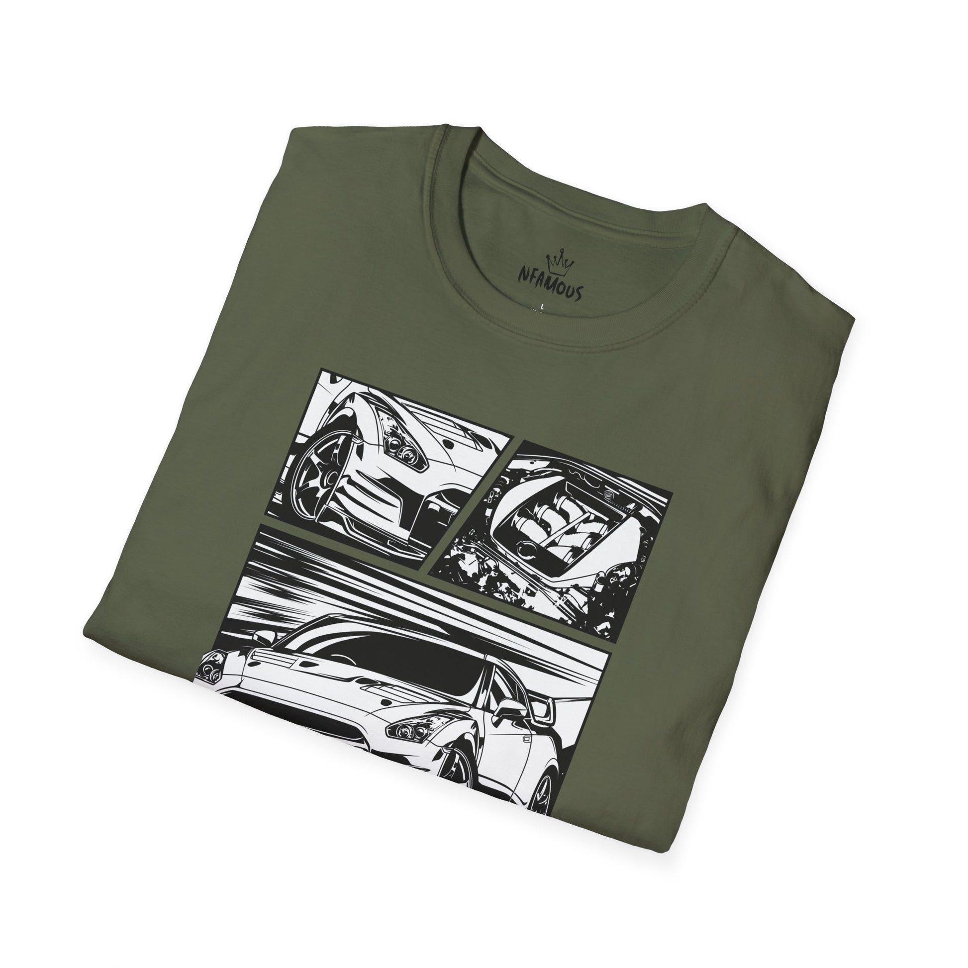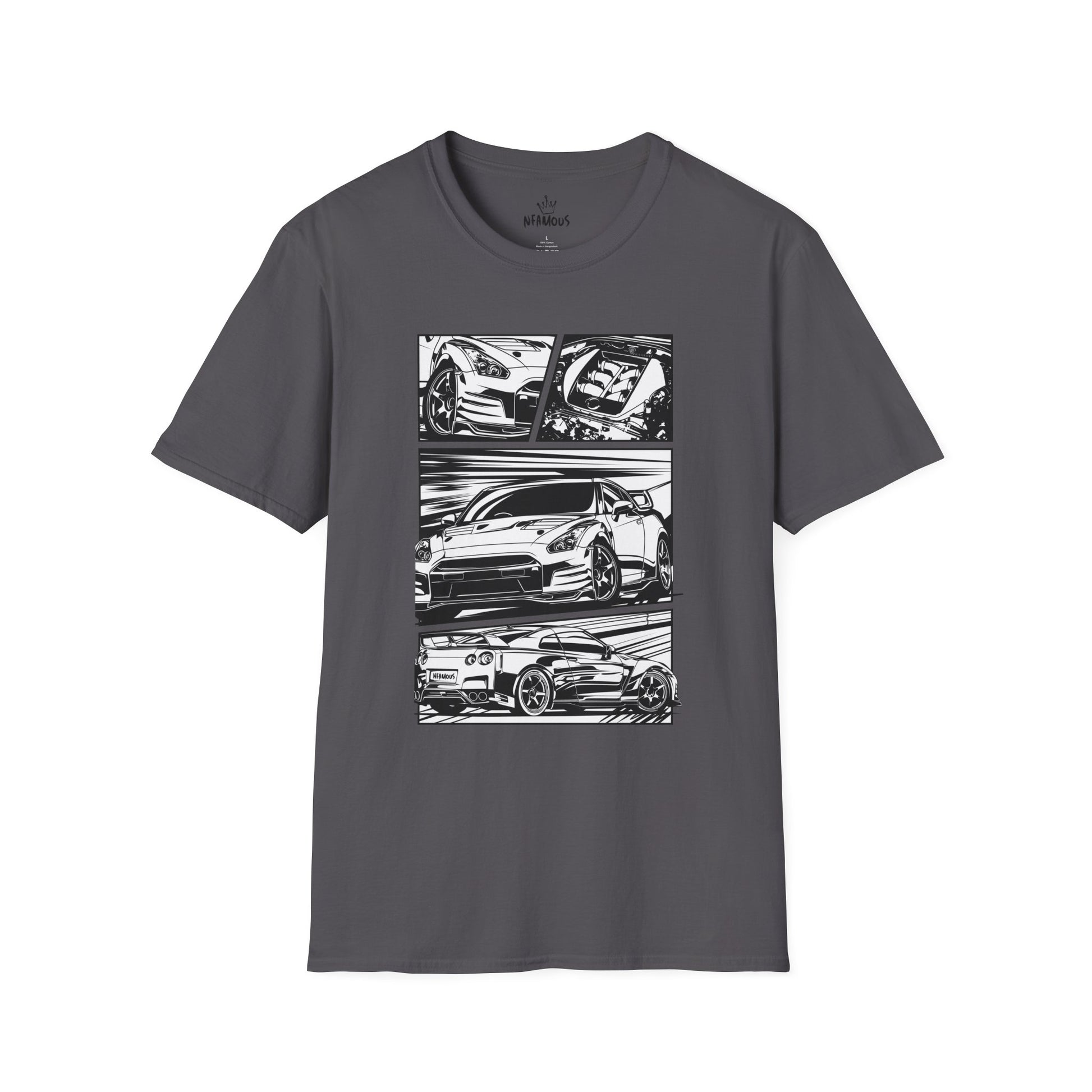 This lightweight tee puts the thrill of the race on your chest. Clean black-and-white panels show detailed car sketches — hood, profile, and rear — rendered with bold lines and motion streaks that feel like a lap in fast-forward. The crew neck and classic fit keep the silhouette sharp while the soft ring-spun cotton feels worn-in and breathable. Wear it to car meets, late-night garage hangs, or when you want that quiet confidence of someone who knows horsepower and precision. The subtle logo at the upper back keeps the front artwork the focal point, so the shirt reads both as a statement piece and an everyday staple.